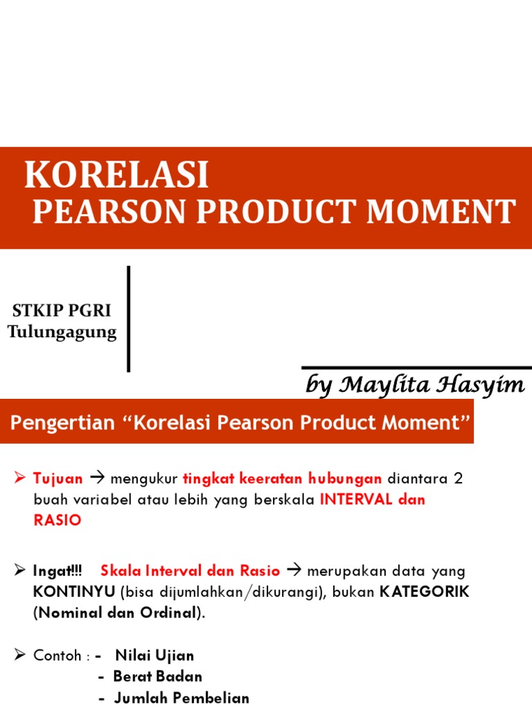 Informasi terlengkap tentang contoh soal dan jawaban korelasi pearson product moment. Korelasi pearson atau sering disebut korelasi product moment (kpm) merupakan alat uji statistik yang digunakan untuk menguji hipotesis asosiatif (uji hubungan) dua variabel bila datanya berskala interval atau rasio. Korelasi product moment atau disebut juga korelasi pearson merupakan analisis korelasi untuk statistik parametrik, yaitu mengukur kuatnya hubungan antara dua variabel berdasarkan pasangan nilai data yang sebenarnya. Kpm dikembangkan oleh karl pearson. Explorable.com, lyndsay t wilson (oct 8, 2009).